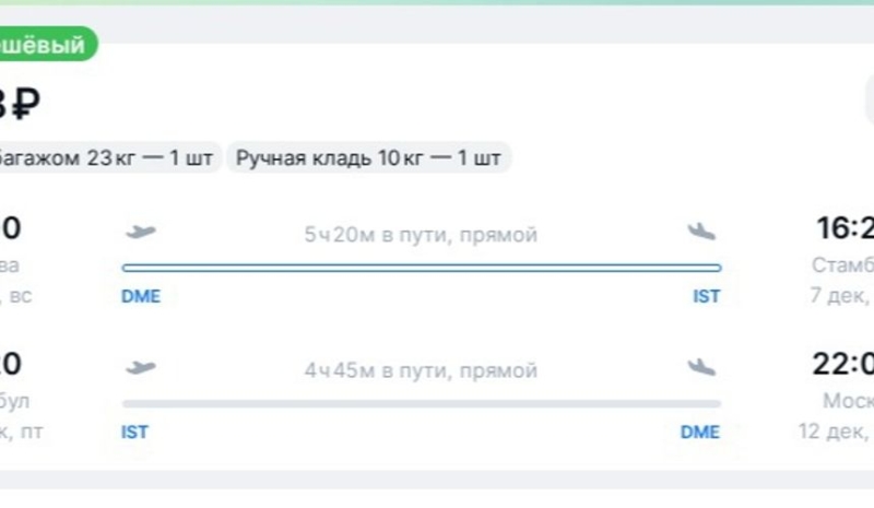 Выяснилось, что на некоторых маршрутах все-таки можно сэкономить. Но совсем немного – на 2–3 тыс. Если вы планируете краткосрочную поездку в Турцию, то все же стоит присмотреться к инициативе S7. Так, на вылет из Москвы в Стамбул 7 декабря и возвратом 12-го можно приобрести место за 13,7 тыс. руб. Ближайшая альтернатива – у Southwind за 17,8 тыс.